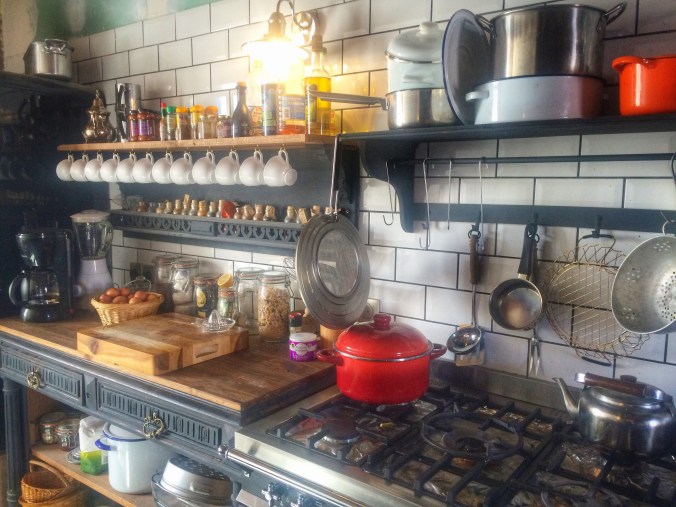 Our first meal (stewed lamb and grilled vegetables and roasted potatoes) was served on the long wood table in the warm and inviting black and white kitchen, one of the most complete rooms in the house. This is obviously the heart of the home, and we have lunch and dinner together here every day.