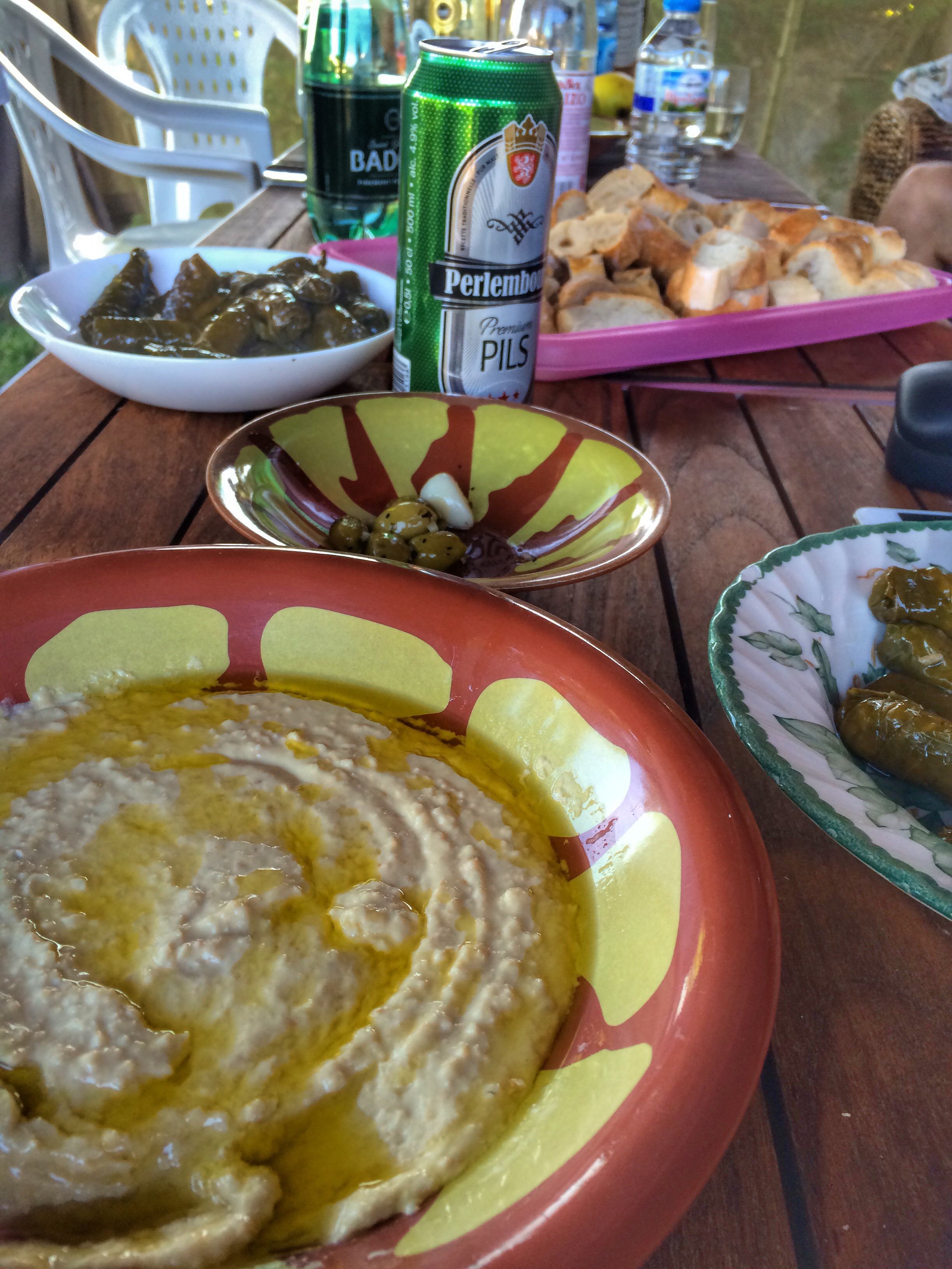 It was a beautiful evening, and the originally casual plan of hummus and bread for a light dinner turned into a huge delicious meal including chips and curry, olives, preserved lemons, dolma, burgers, and plenty of wine and beer.
